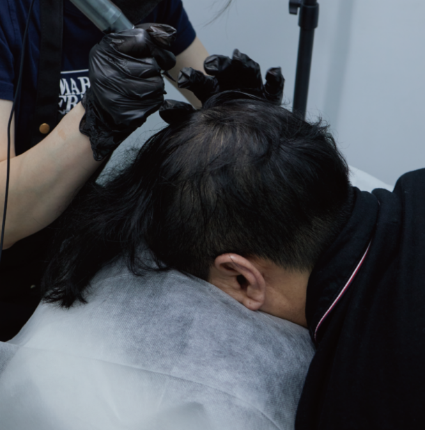 A:蒔物所的超層次金點技術分為淡入、中階、高階色調,髮際線會以淡入的方式操作,以淺灰色乳打造漸層濃密感。髮際線就好比一對漂亮的眉毛,並不是越濃密就越好看,接近額頭處以最輕柔的方式點出若有似無的擬真毛囊,整體呈現才會更加自然。